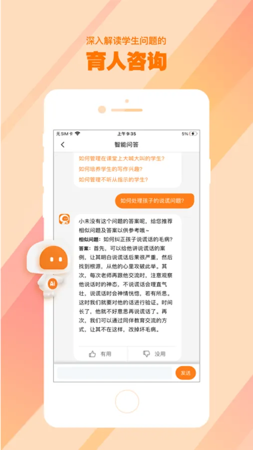 针对常见的学生问题进行解答,用户以知识问答的形式与系统交互,可以体验到育人疑问直接高效解决,并获得系统智能推荐的相似问题及答案。