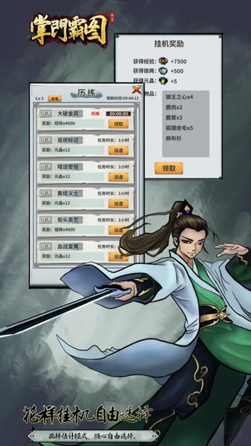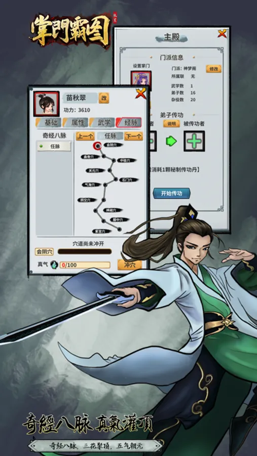 管理弟子包括:修炼、历练两种种模式。选择指定的弟子修炼,修炼完毕可以获得丰厚阅历。选择弟子历练,不同的历练任务可以获得生产材料。可以赚取银两等等。对于拥有众多弟子的掌门,每天的修炼是必不可少的。同时可以使用银两或元宝对修炼、历练、的收益加成。