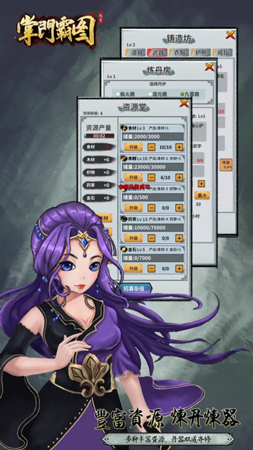 门派的各种资源都可以通过到江湖中占据资源点进行生产,招募杂役去生产,每次打开游戏都可在门派中收获定量资源。