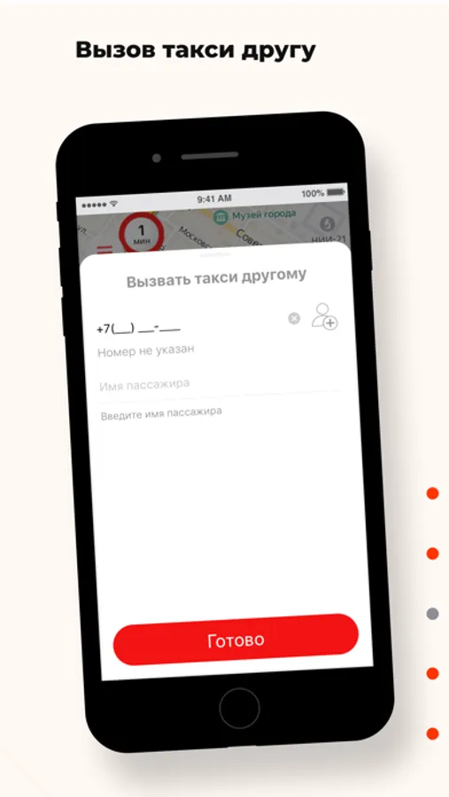 Используйте опцию “Вызвать такси другому” в разделе “Пожелания” и укажите его номер телефона. Когда такси подъедет, на указанный номер придет СМС, а вам — сообщение в приложении.