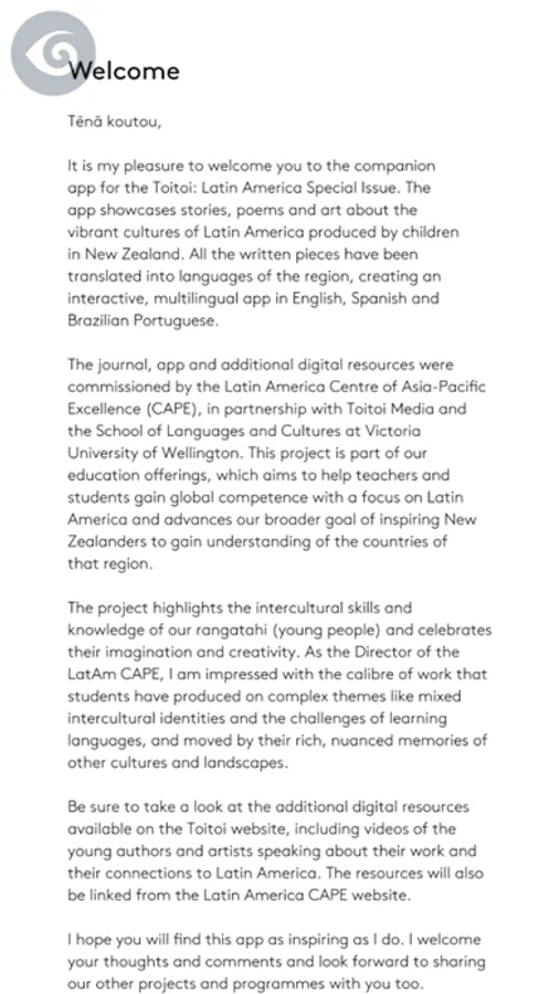The companion app for the Toitoi: Latin America Special Issue showcases stories, poems and art about the vibrant cultures of Latin America produced by young New Zealanders. All the written pieces have been translated into languages of the region, creating a multilingual app in English, Spanish and Brazilian Portuguese.