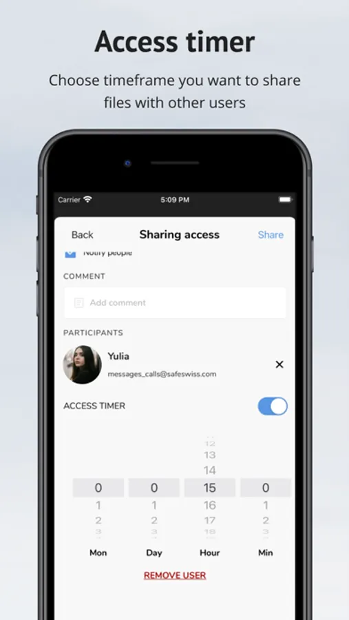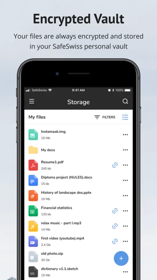 • Encrypted Vault: Your files are always encrypted and stored in your SafeSwiss personal vault