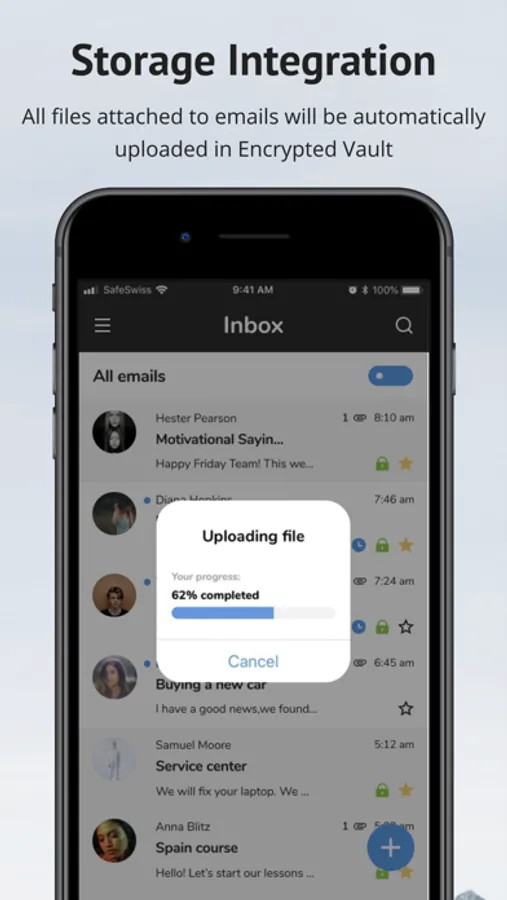 • Storage integration: All files attached to emails will be automatically uploaded in Encrypted Storage