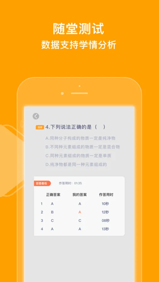 【随堂测试-客观题】学生使用智能笔在点码本上勾选答案或直接通过APP触屏选择答案,老师同步查看答案及选项分布,答题用时同步显示;