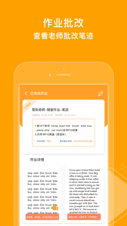 【作业批改】老师在线布置作业,学生收到作业提醒,完成作业上传后,可查看老师的批改笔迹并生成错题本,强化练习;作答数据会生成报告发送给家长;