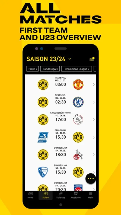 News: On your startscreen you can find the most recent news, videos and social media postings about BVB. Simply swiping up and down you can get up to speed quickly on everything relevant about our club.