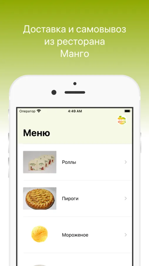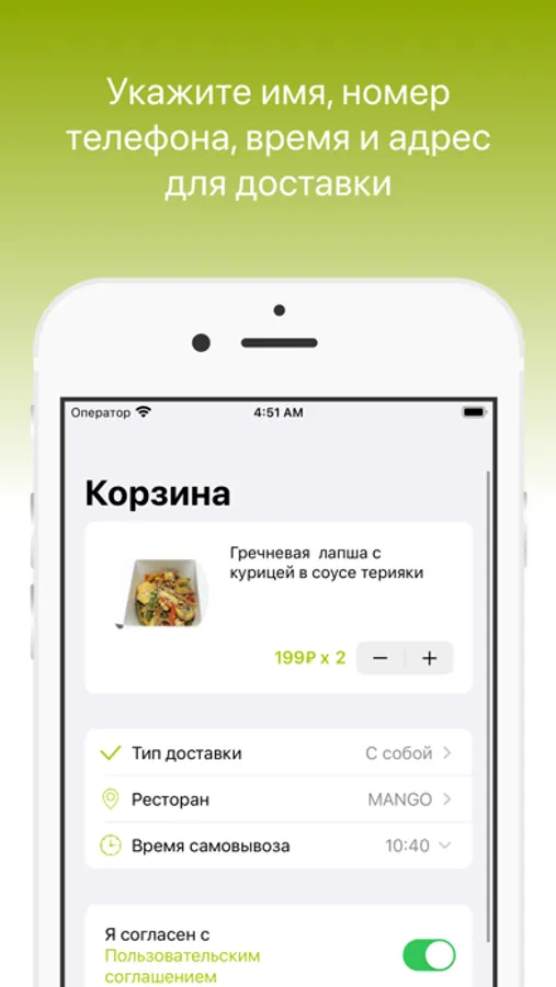 Как сделать заказ в приложении “MANGO”: выберите понравившиеся позиции из меню, добавьте их в корзину и перейдите на экран оформления заказа (по нажатию на иконку корзины).