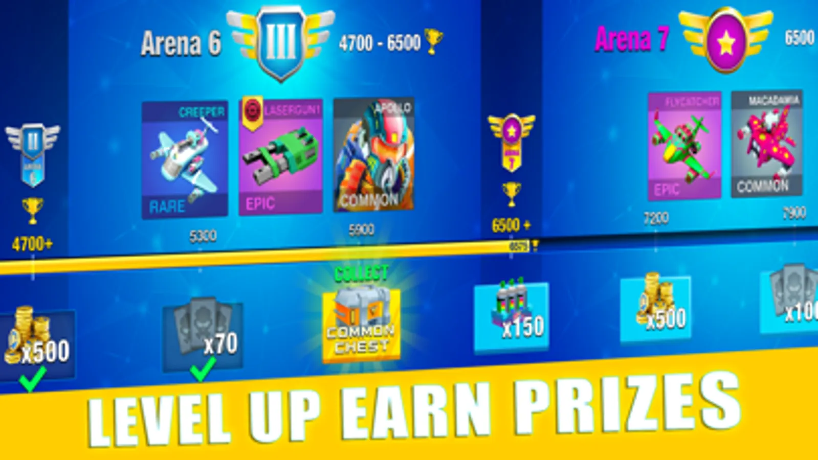 Progress through numerous arenas. Level up your ranks to earn different prizes.