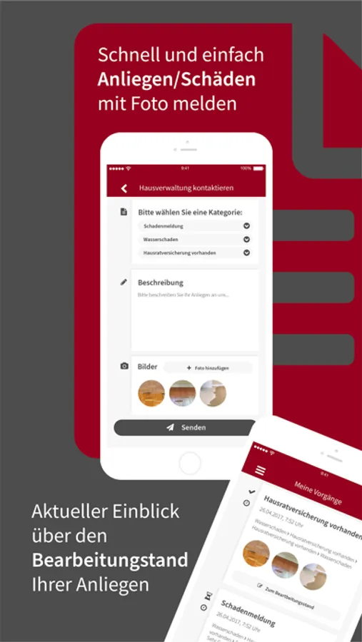 Als Mieter oder Eigentümer können Sie Schäden oder Anliegen direkt mit Fotos über unsere App melden. Ihre Anfragen stehen unseren Mitarbeiten dann zur Verfügung und können auch an Handwerksbetriebe weitergeleitet werden.