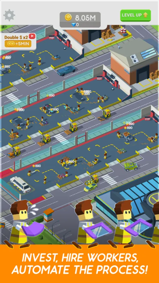 Develop your car factory by constructing new workstations and buildings. Upgrade parking to get more workers and expand your car business.