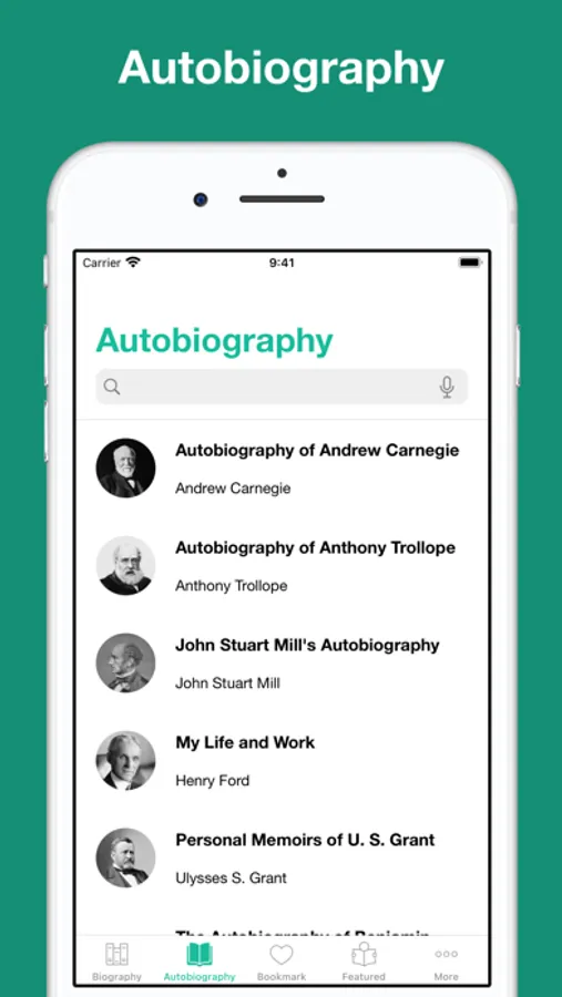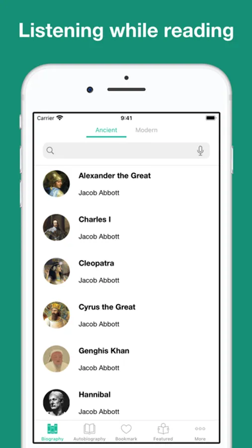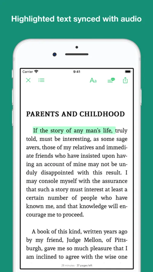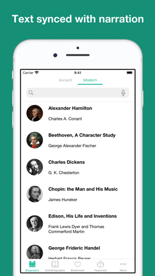 This app provides biography and autobiography books with human narration. It includes read along feature: professional recorded narration plays along while you read.