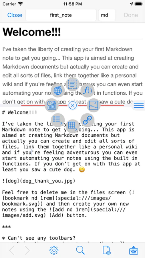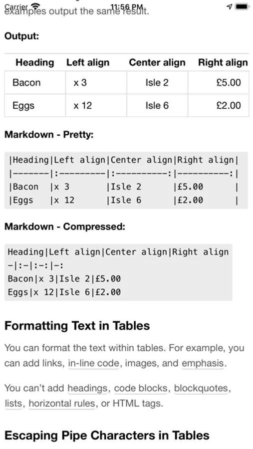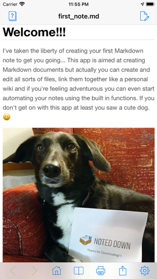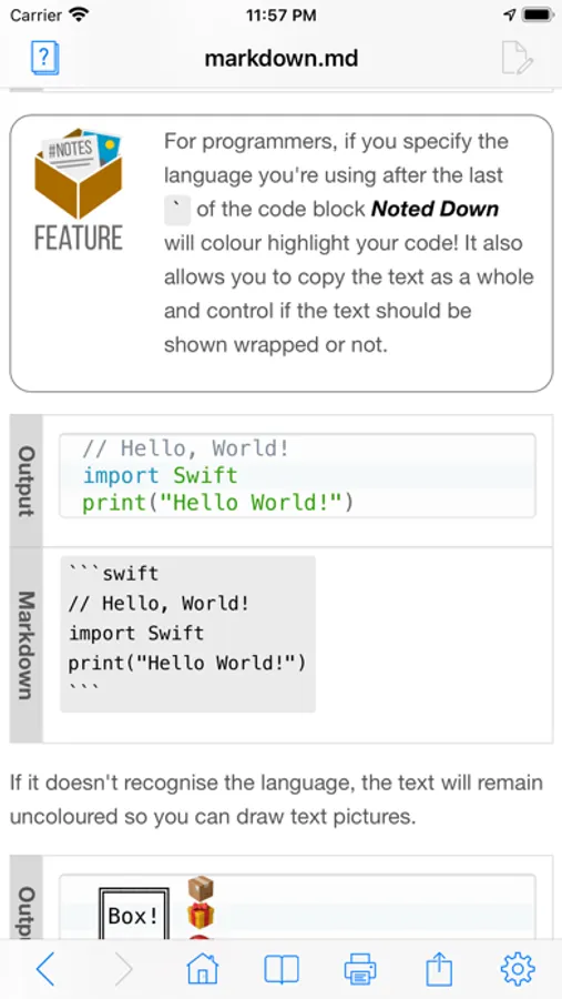 The extended version of markdown in Noted Down gives you all the normal markdown stuff as well as supports for tables, code highlighting, table of contents generation and checklists as well as functions to further automate your notes. It includes local help files so you can work while offline.