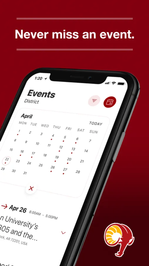 The event section shows a list of events throughout the district. Users can add an event to your calendar to share the event with friends and family with one tap.