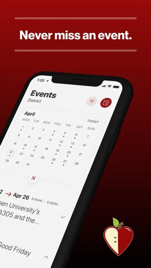 The event section shows a list of events throughout the district. Users can add an event to their calendar to share the event with friends and family with one tap.
