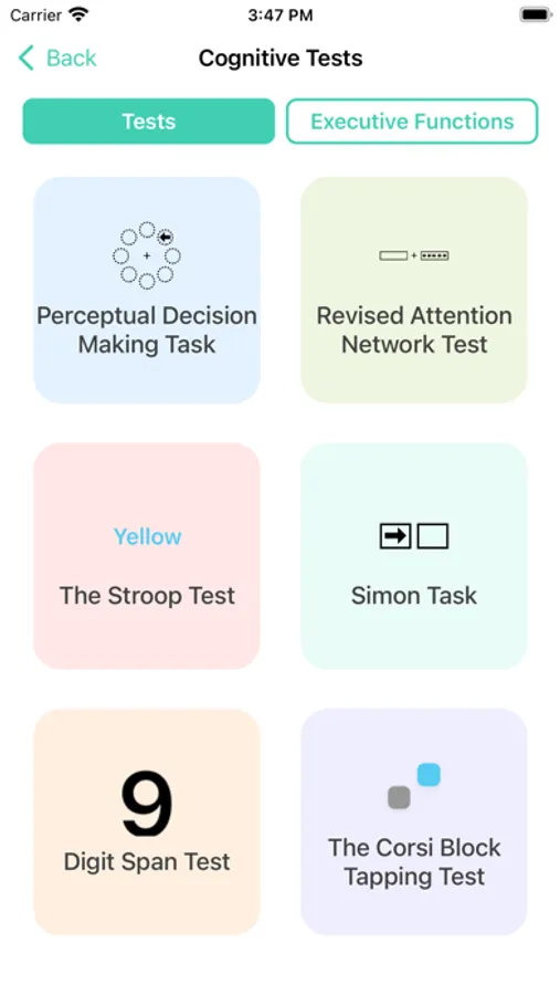 Cognition is an extra feature for users to test their cognitive function. The users can choose between different tests and executive functions to test. Users can see statistics (average and best scores as well as reaction times) for each test and executive function.