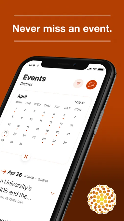 The event section shows a list of events throughout the district. Users can add an event to your calendar to share the event with friends and family with one tap.