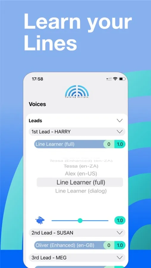 Turning text into speech is rapidly evolving with companies like Apple making huge strides each year to make more realistic voices. Because this app uses Apple voices it means that at the moment it sounds a bit like Siri. Maybe not the best acting, but getting better all the time. We have found it takes about five minutes to get used to the voices and really get into the script, so hang in there, it’s worth it!