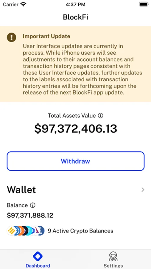 BlockFi previously allowed users to manage their crypto portfolio using the BlockFi app. On November 28, 2022, BlockFi and certain of its affiliated companies filed for chapter 11 bankruptcy in the United States Bankruptcy Court for the District of New Jersey. At this time, many of the platform's capabilities, including transfers and withdrawals, are currently paused.