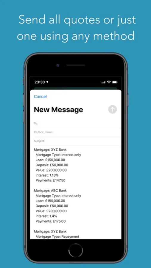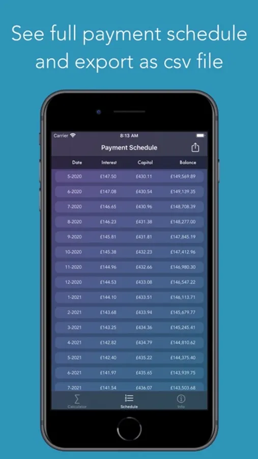 Multiple sharing options let you share all quotes, a single quote or export the payment schedule as a .csv file to open in Excel or Numbers etc.