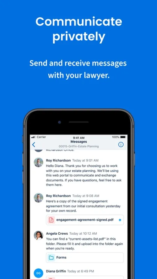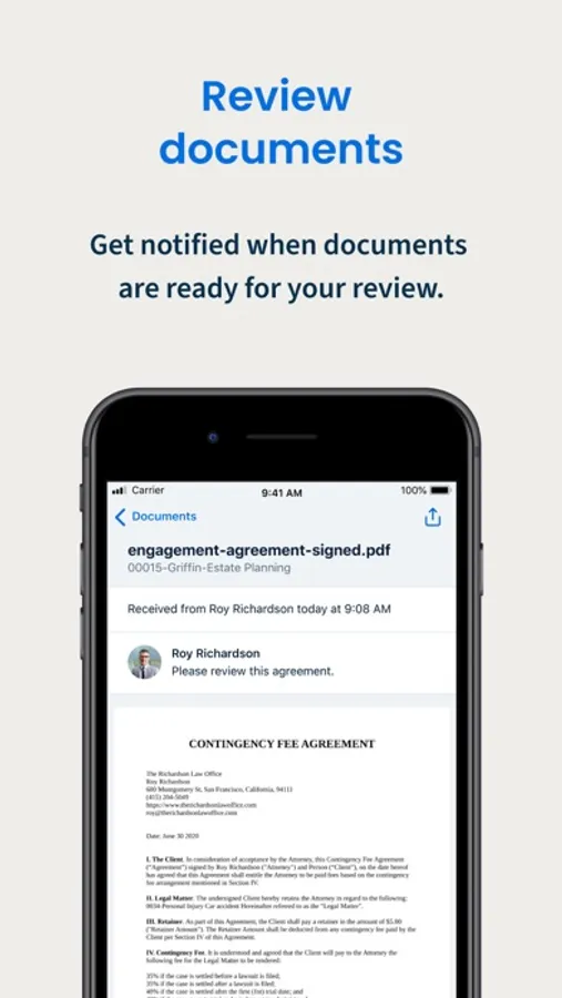 ∙ Stay on top of your case. Keep files and messages organized in one central place and get notifications when documents are ready for review.