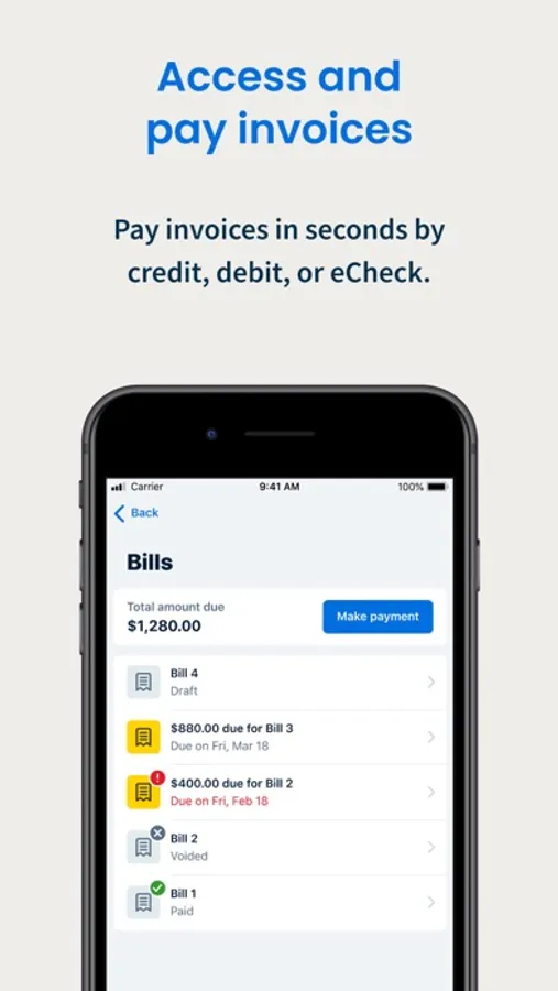 ∙ Access and pay invoices. Make payments in seconds with credit, debit, and eCheck options or view your payment history.