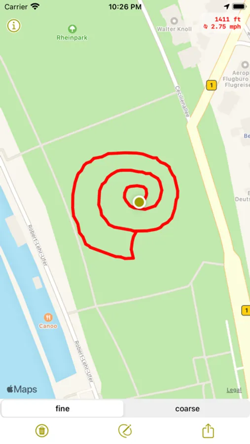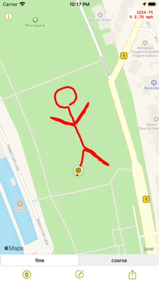 Everyone is an artist. Go outside and embrace your creativity. With walk2draw you can choose between two modes. In fine mode it adds a point for each meter you move in the real world. In coarse mode the distance between points is ten meters. Coarse mode is perfect when you want to record a trip or your commuting.