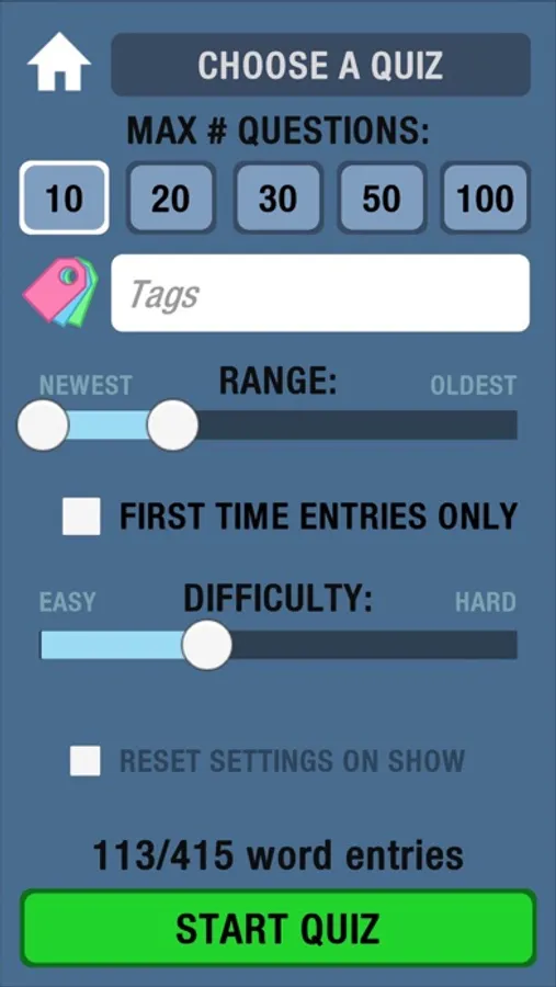 Introducing an app for testing yourself on language vocabulary. First, select your two languages. Then enter a list of words and translations, and create your own category tags. Finally, customize quizzes by number of questions, categories to include, difficulty, and newness.