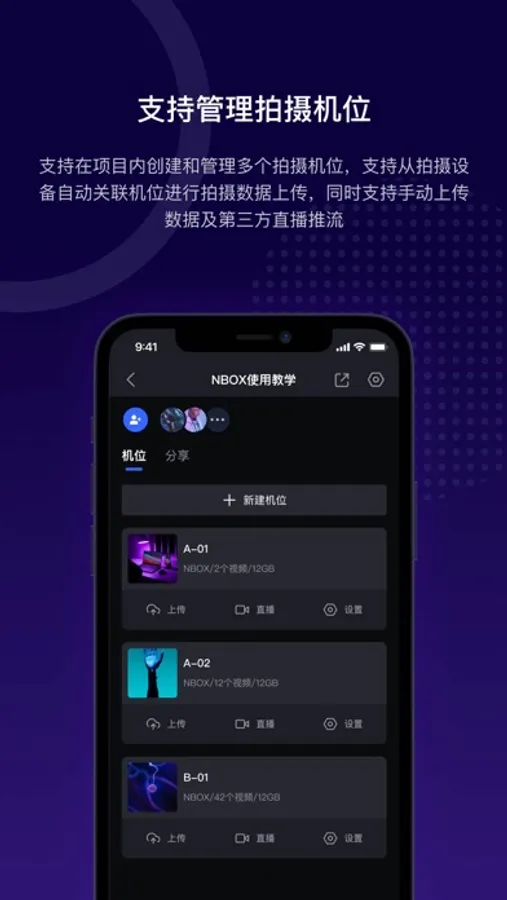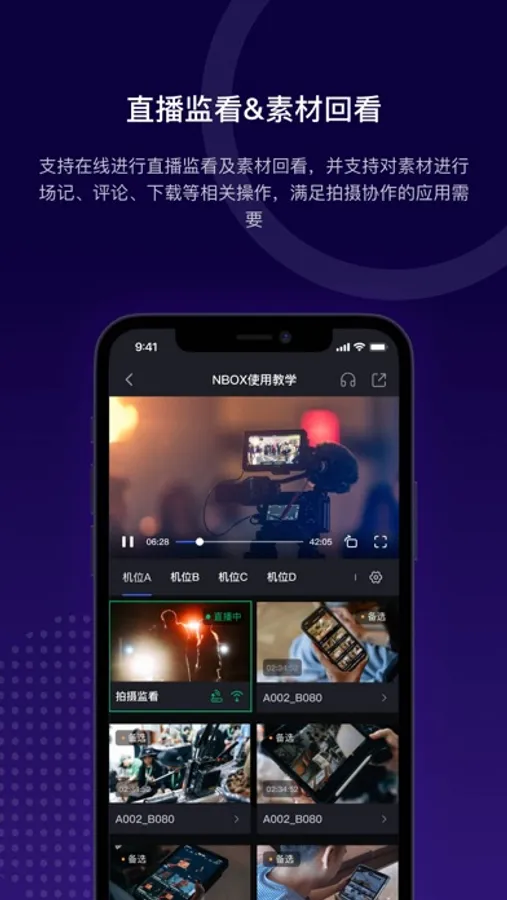 直播监看:支持从NBOX推送或从第三方软件推流直播流至机位,在线监看当前拍摄画面,实时了解当前的拍摄现场状况和进程。