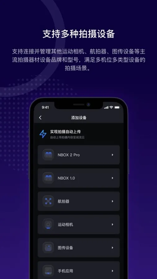 设备管理:支持连接并管理NBOX设备、运动相机、航拍器、图传设备等主流拍摄器材设备品牌和型号,满足多机