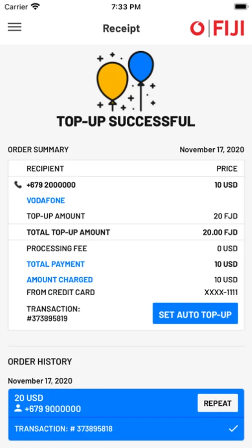 • Quickly Repeat Your Last Top Up - Single touch "Repeat Top Up" option lets you send to the same phone number with the same amount instantly.