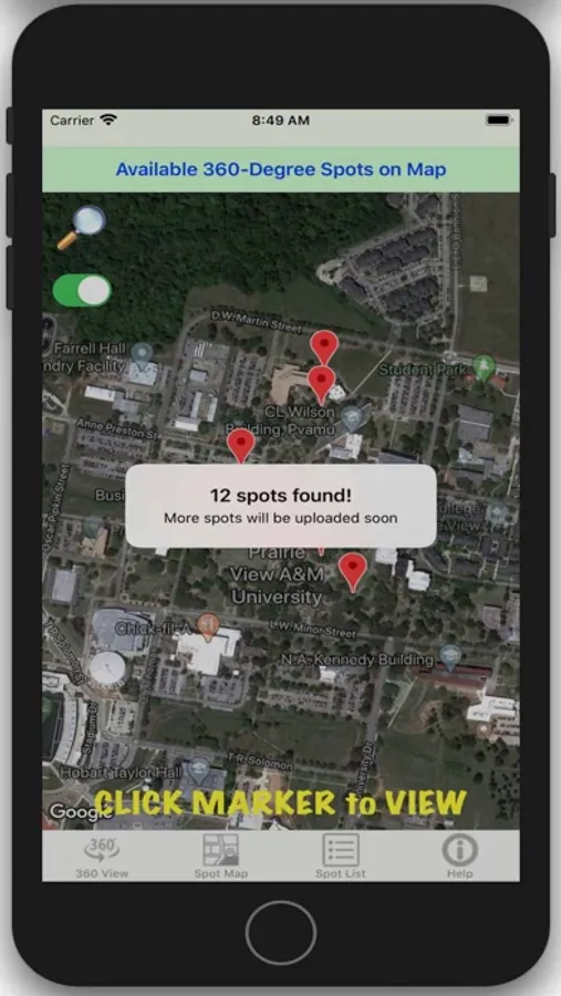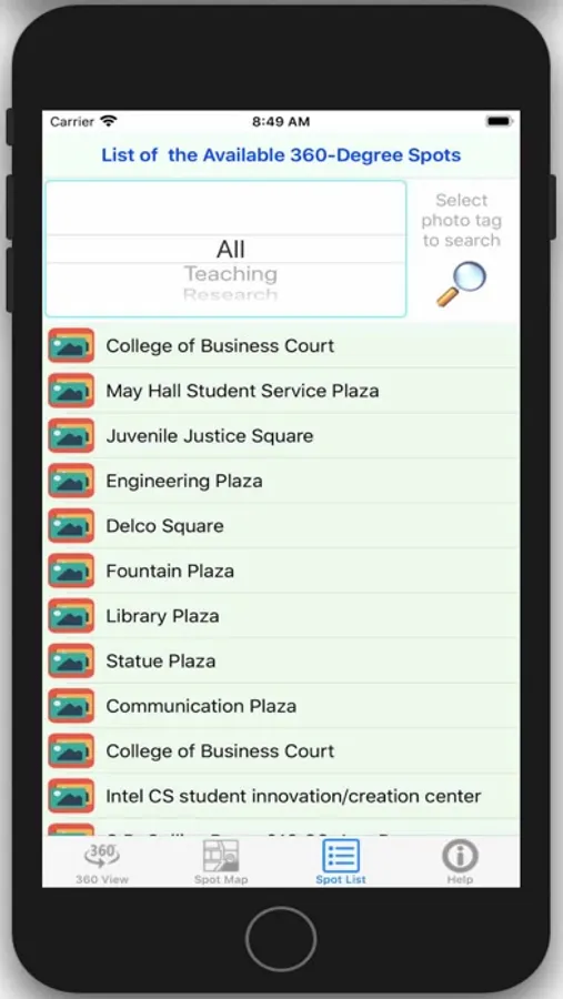 The app shows all the markers of hotspots on the campus map, and the user clicks a marker to view that location in 3D 360-degree. It also allows users to search for and list spots in a table view, and then click to view. Each hot spot is tagged as one of these: teaching, research, Students, Campus, Sports, Events, or Others.