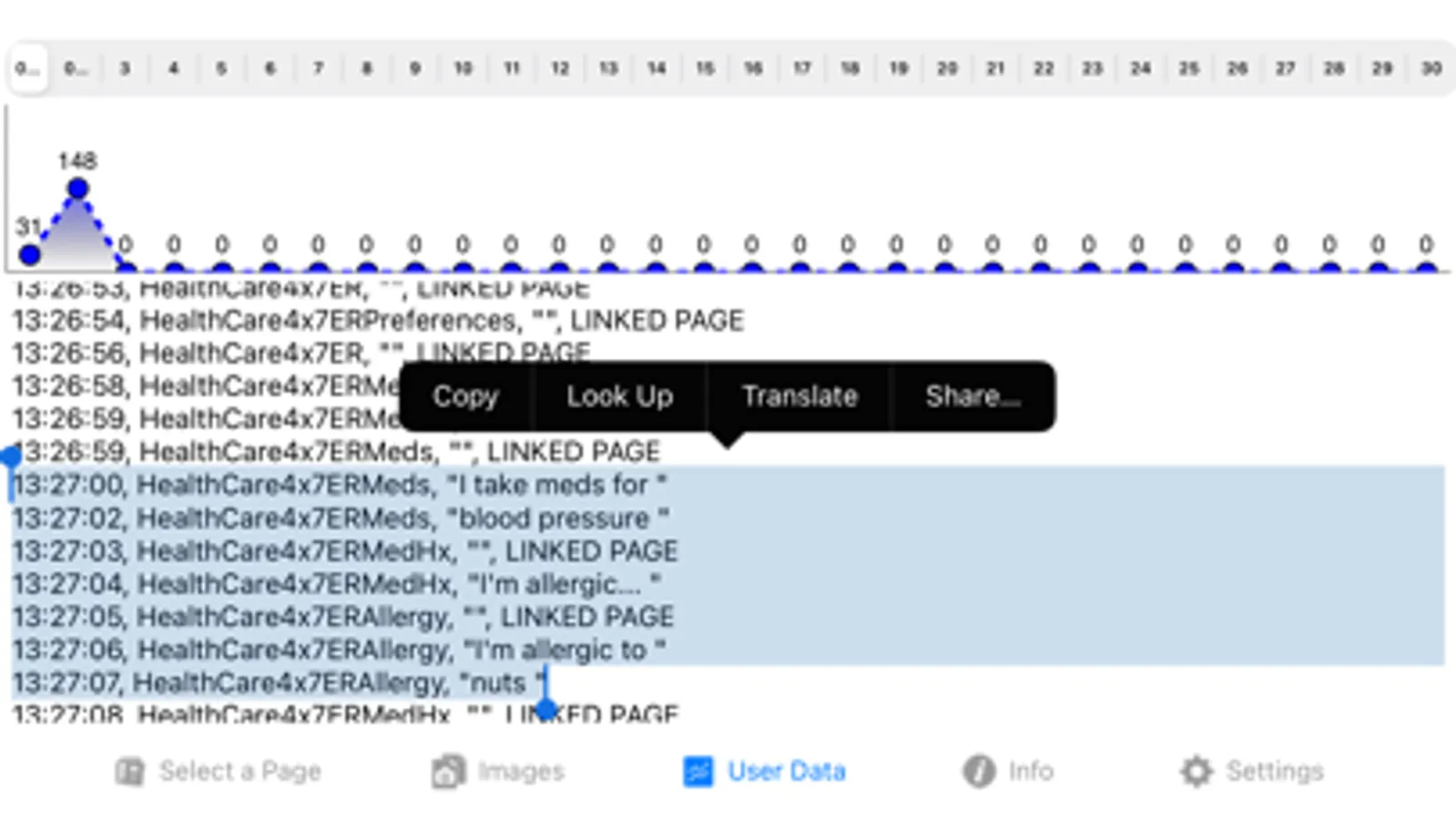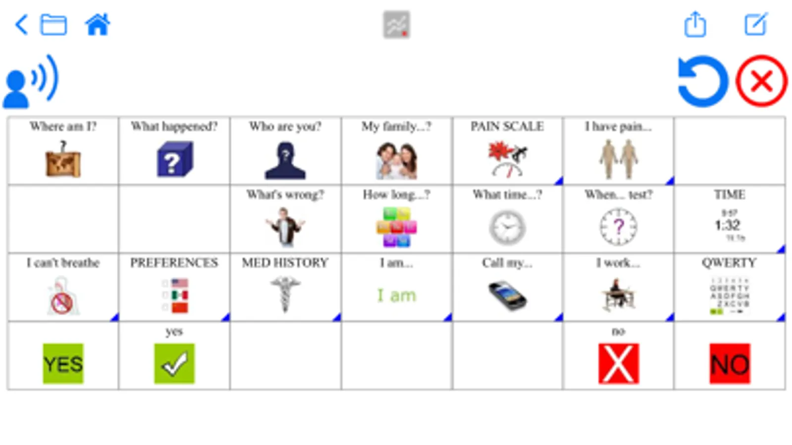 • Pages for concerns and questions, pain, body, breathing, preferences, phone calls, conditions and feelings, medical history, medications, health issues, allergies, work, and time