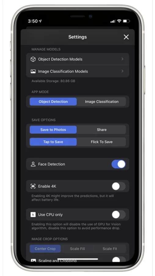 Neural Object Detector was designed to be used by both developers and people who are enthusiastic about Machine Learning, Computer Vision, and Object Detection / Image Classification using the combination of both. Neural Object Detector, by default is bundled with YOLOv3 model, which is a neural network for fast object detection that detects 80 different classes of objects. In addition to that, the app allows the users to import any custom machine learning model designed for object detection or image classification, with a single tap, the downloaded model can be imported via the Files app import window which is available within the app by simply pressing the plus icon on the models view so users do not have to leave the app. The app, based on the model selected, draws a rounded rectangle over the detected objects, the annotated image can be rendered and saved to photos or shared if the user chooses to share it directly from the app. To meet every users needs a handful of settings for computer vision algorithm and camera resolution can be changed. Users have the option to enable CPU only mode, which helps test their models under that specific condition.