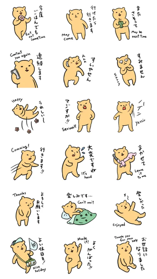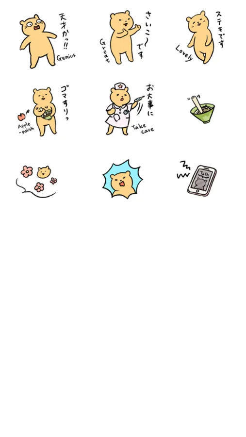 The cute and popular bears give the stickers an easy to use social greeting! The bear is with us through the good times and the blue times! A total of 27 types of bear stickers.