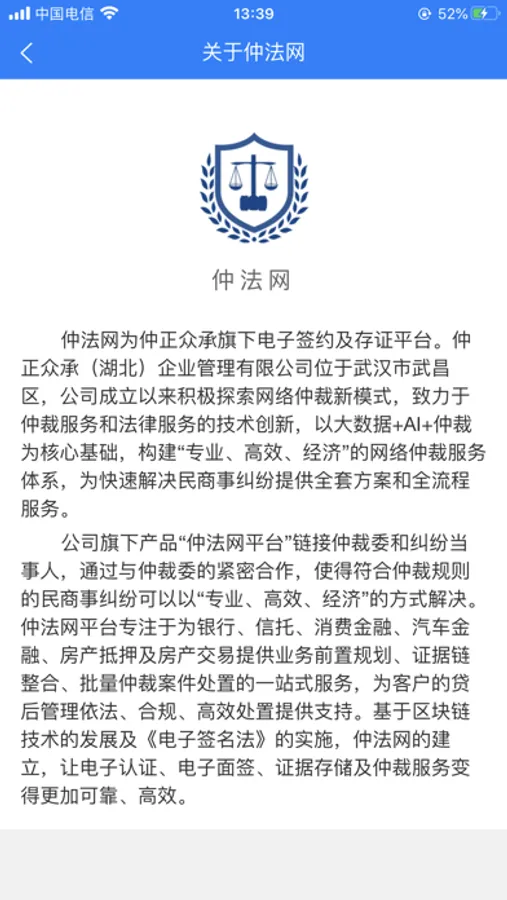 仲法网为仲正众承旗下电子签约及存证平台。仲正众承(湖北)企业管理有限公司位于武汉市武昌区,公司成立以来积极探索网络仲裁新模式,致力于仲裁服务和法律服务的技术创新,以大数据+AI+仲裁为核心基础,构建“专业、高效、经济”的网络仲裁服务体系,为快速解决民商事纠纷提供全套方案和全流程服务。
