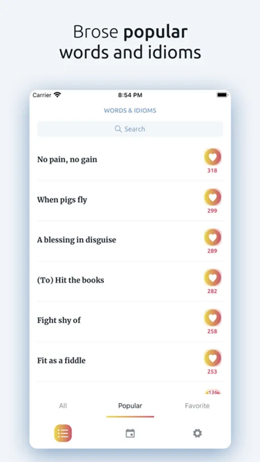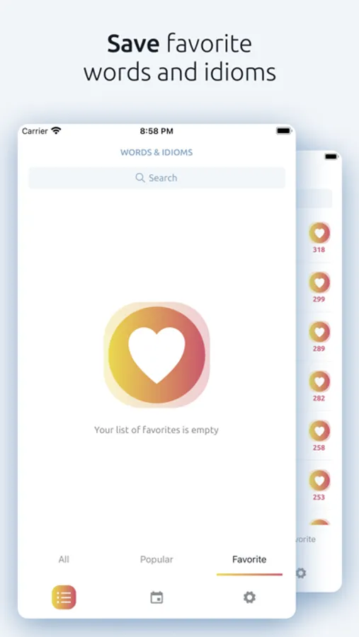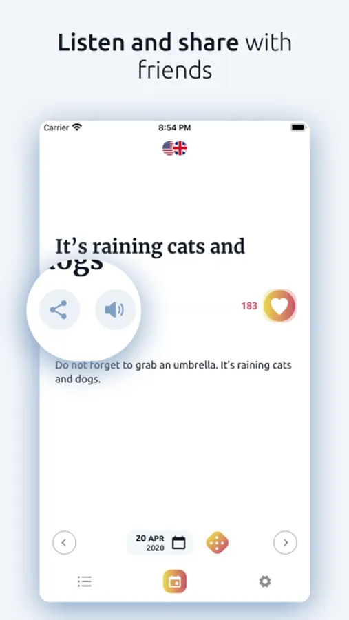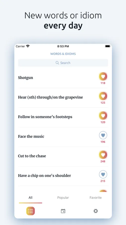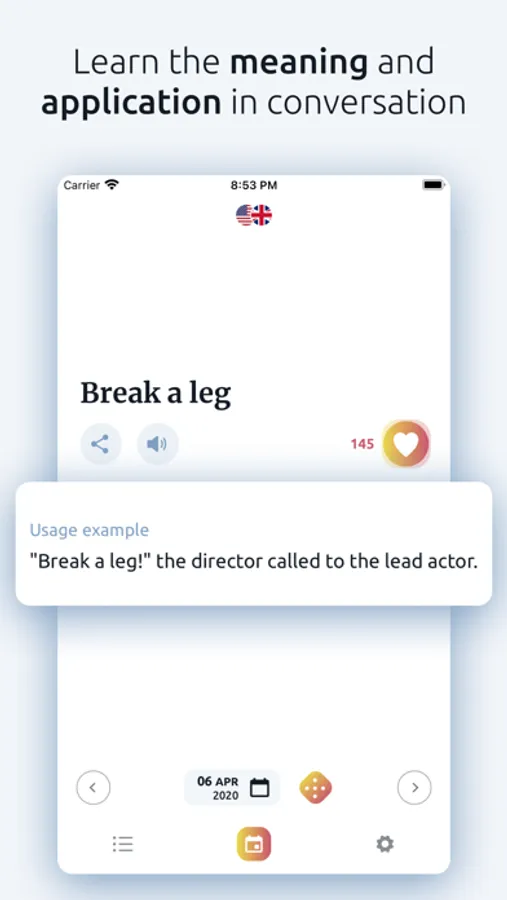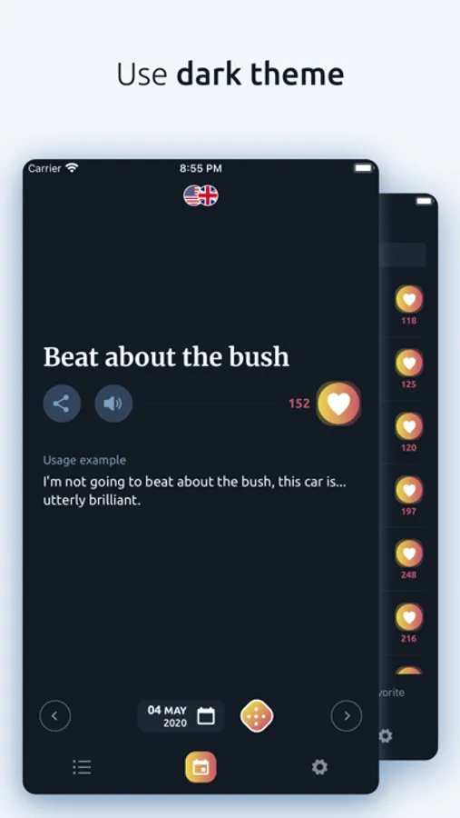 Mark the words and idioms you like so you don't get lost and return to them. Share words and idioms with your friends on social media. The application is designed in light and dark themes for ease of use.