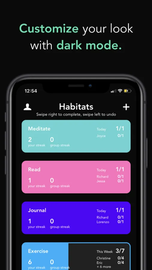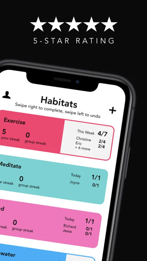 Create a habit/goal group (we call them habitats) for each of the habits you want to track and invite your friends! Or, join the habitats your friends create and invite you to.