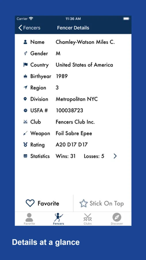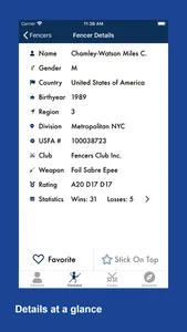 Fencing Tracker gathers public information of USFA members' information from the official USFA website, usafencing.org. The app displays information of each USFA member, including name, gender, representing country, birth year, region (if the member lives in the US), division (if the member lives in the US), USFA number, affiliated club(s), rating for each weapon, and tournament statistics. In the Fencer Details page, the user is able to select “Link to Favorite” in order to link a fencer to the Favorite page.