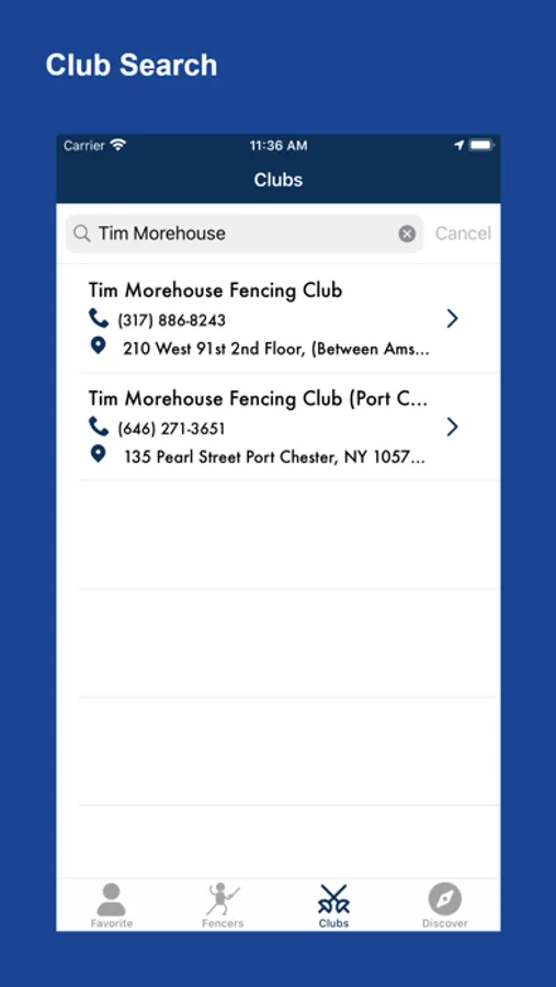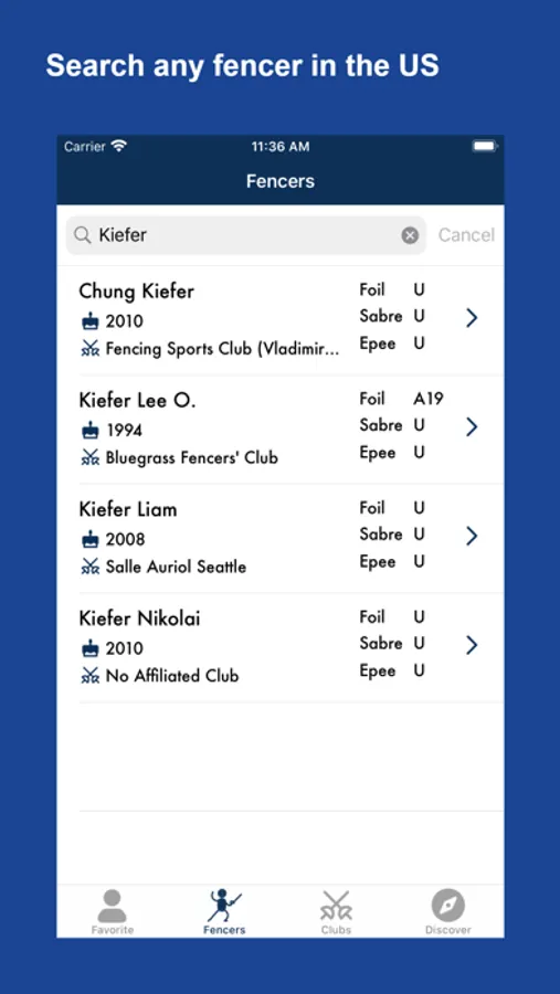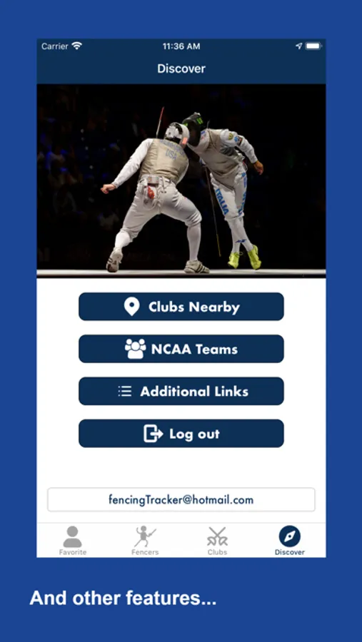 The fencing tracker has a Discover tab, which contains features including the Clubs Nearby, NCAA list, and Additional Links.