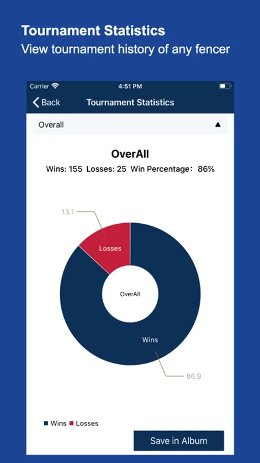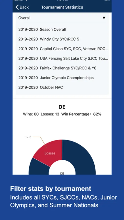 Fencing Tracker gathers public information of national-level tournaments (SYC, SJCC, NAC, Junior Olympics, Summer Nationals) from fencingtimelive.com. In the Fencer Details page, there is a tournament statistics page that displays USFA members' tournament statistics, including pool bouts, Direct Elimination (DE) bouts, pool bouts that ended with a one-point difference, and overall bouts. For each type of bout, the win-count, loss-count, and win-percentage is displayed. In the tournament statistics page, there is a drop-down list containing an “Overall” option, all the fencing seasons since the 2019-2020 season, and all the national level tournaments that the fencer has participated in. The user can select overall, the season overall, or a specific tournament to see the tournament statistics of the selected tournament(s).