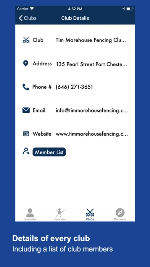 Fencing Tracker gathers public information of clubs registered to the USFA from the official USFA website, usafencing.org. The app displays information of each club, including address, phone number, email, website, and a member list. In the member list of each club, it can be filtered by gender and weapon rating.