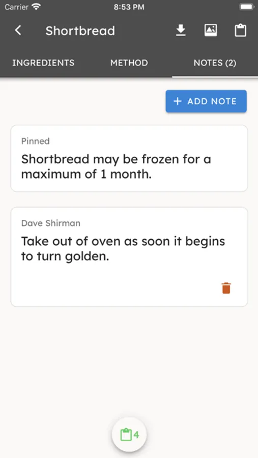 • Adding personal notes to recipes and optionally sharing them with your group.