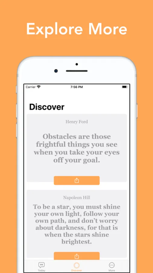 Let yourself be motivated by the words of the most successful and inspiring people in the world. Discover their thoughts by receiving a great quote and some motivating words every day. Explore even more in the awesome Discover tab. Follow many other people and become motivated and inspired.