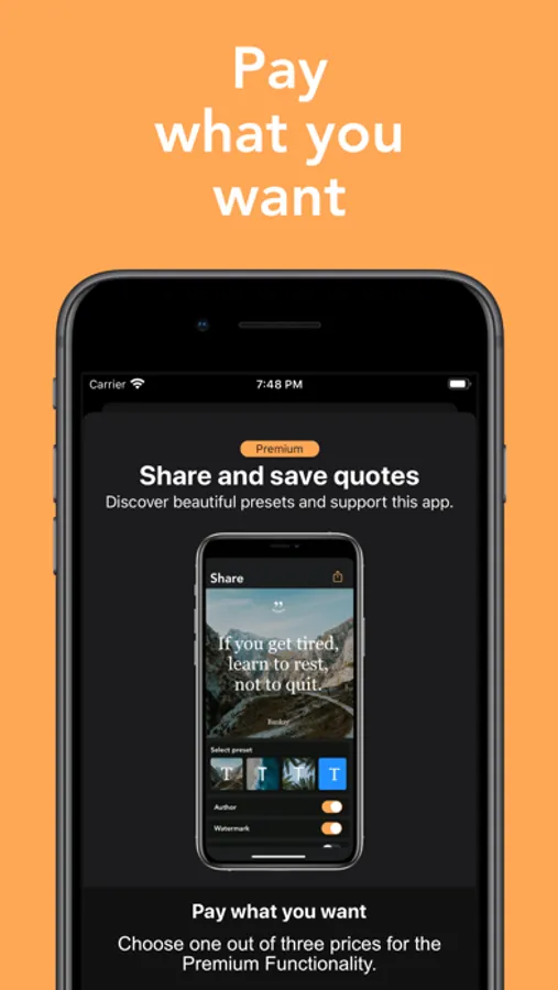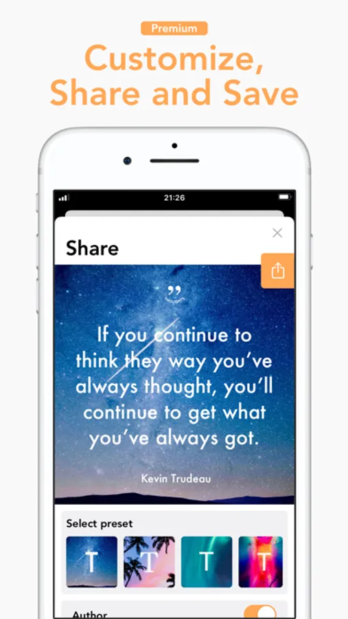 Store quotes you like in your photos or share them with your family and friends. Choose from different beautiful presets to customise the quotes (requires a one-time in-app purchase).