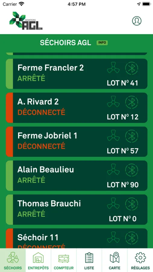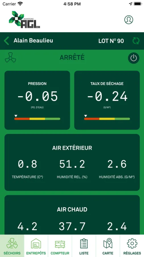 At a glance, find the list of your registered dryers, the drying stages completed as well as the different programmed batches. Each dryer can be started or stopped remotely. Monitor the drying and cooling times. Increase or decrease the drying time as needed. Observe the static pressure, the drying rate, the temperature, the humidity level of the outside air, the hot air and the humid air.