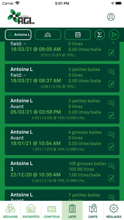 At a glance, see the number of hay bales produced and the amount of Hay Solution applied for each project, with the client's name, location and date.