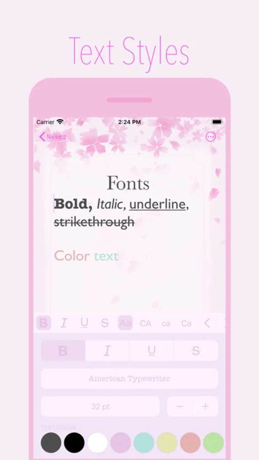 - Text styling (font, font size, bold, italic, underline, strikethrough, text colors, pragraph alignment, paragraph indent)