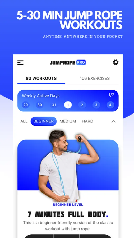 Jump Rope App workouts are built around different combinations of jump rope and bodyweight exercises to help you burn calories, build strength, and improve endurance. Workouts range from 5 to 30 minutes.