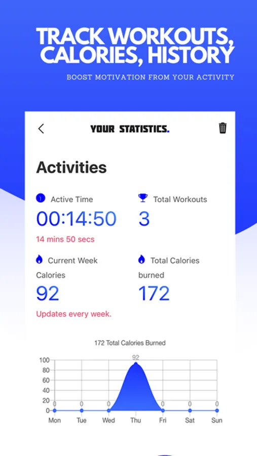 - Activity tracking makes it easy to follow your workout completion, progress, and total calories burned.