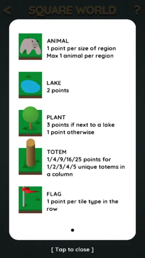 Square Worlds combines boardgame and puzzle game elements into a simple tile placement game with hidden depth. You must optimally place tiles into a 5x5 grid to earn the most points, whilst keeping an eye on your coins! Each type of tile scores points in a different way, making for some rich and moreish gameplay.